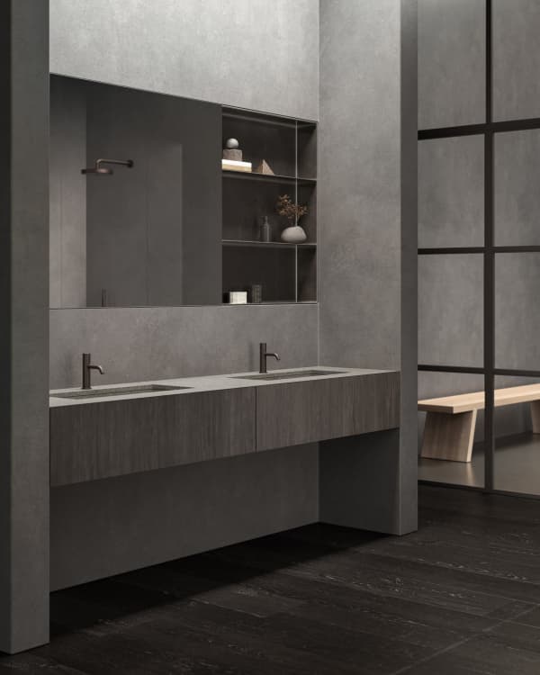 Un diseño con formas reducidas a lo esencial, proporciones puras, volúmenes ligeros. Un equilibrio refinado donde cada elemento encuentra su lugar sin excesos. La materia se vuelve mínima para un baño que expresa medida, armonía y confort cotidiano.