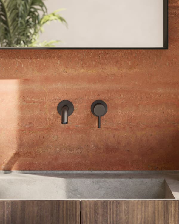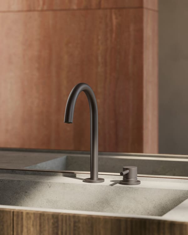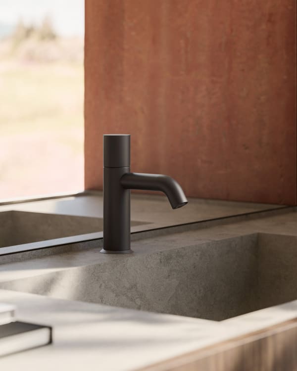 En sus distintas configuraciones – desde el caño de lavabo con grifo con mando a distancia, al caño de techo acompañado de un mezclador mural, hasta el mezclador mural para lavabo –