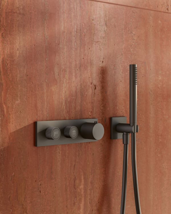 Con una simple pulsación se activan o desactivan las funciones de la ducha, mientras que una ligera rotación de los mandos permite ajustar con precisión el flujo de agua. Una solución versátil, compatible con varias series de grifería de Fantini.