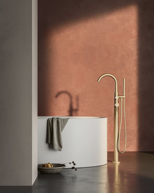 Elegante y refinada la solución de Nostromo para la grifería de bañera a pavimento se presenta aquí.